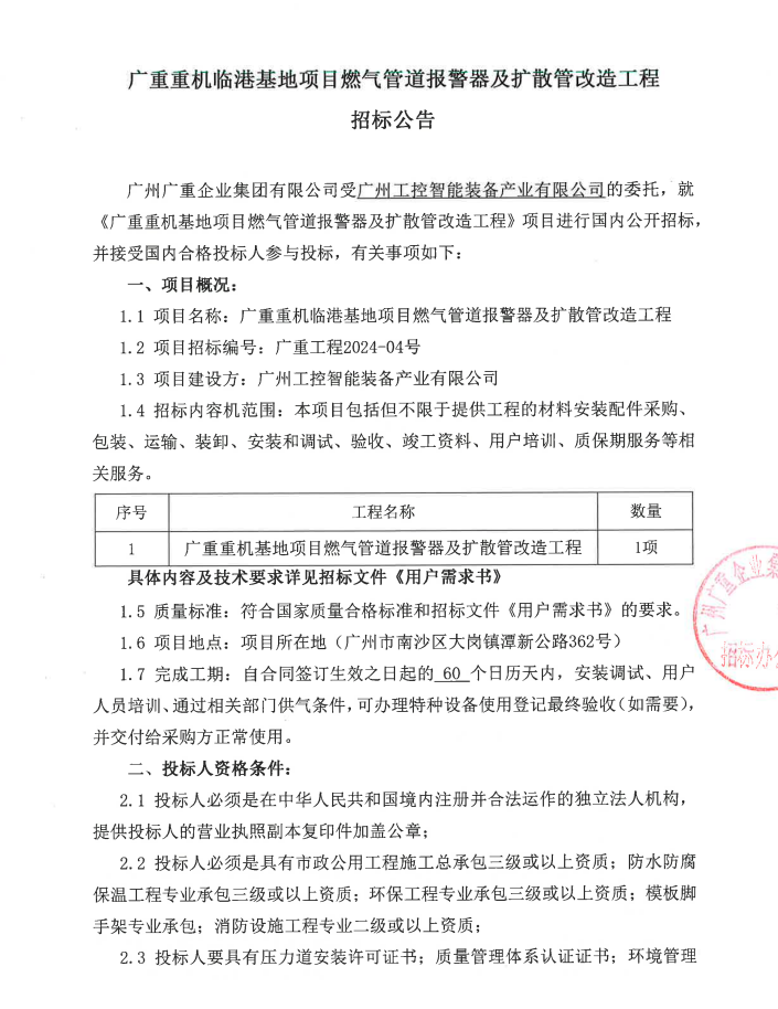 乐鱼网页版页面登录重机临港基地燃气管道报警器及扩散管改造工程项目招标公告