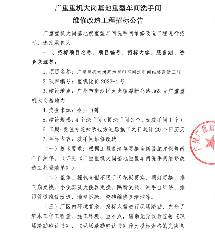 乐鱼网页版页面登录重机大岗基地重型车间洗手间维修改造工程招标公告