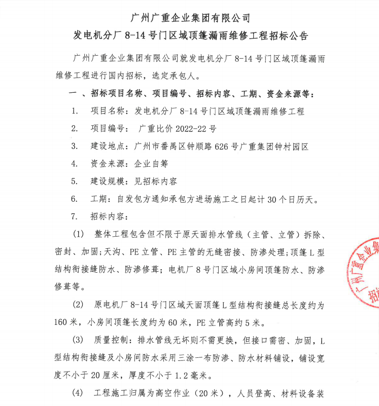 乐鱼网页版页面登录集团发电机分厂8-14号门区域顶篷漏雨维修工程招标公告