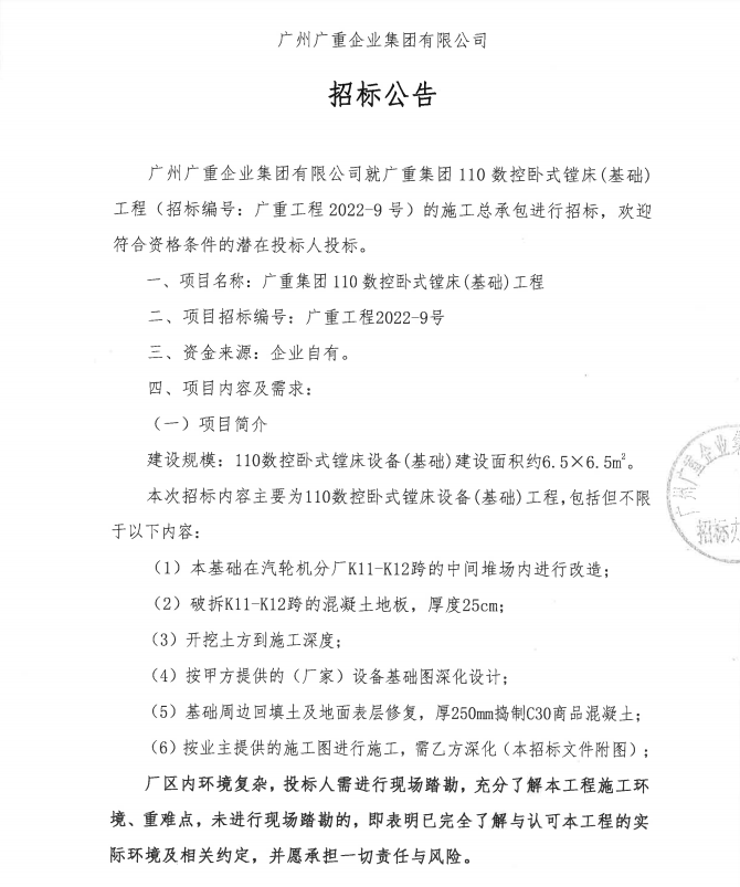 【乐鱼网页版页面登录工程2022-9号】招标文件--乐鱼(中国)分厂110数控卧式镗床设备基础工程.docx