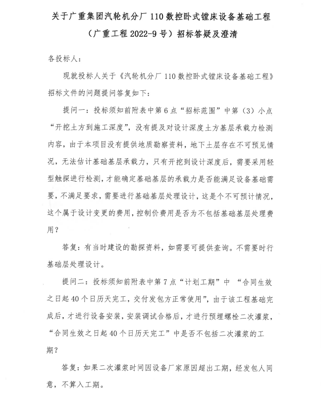 乐鱼网页版页面登录集团110数控卧式镗床(基础)工程项目招标答疑及澄清