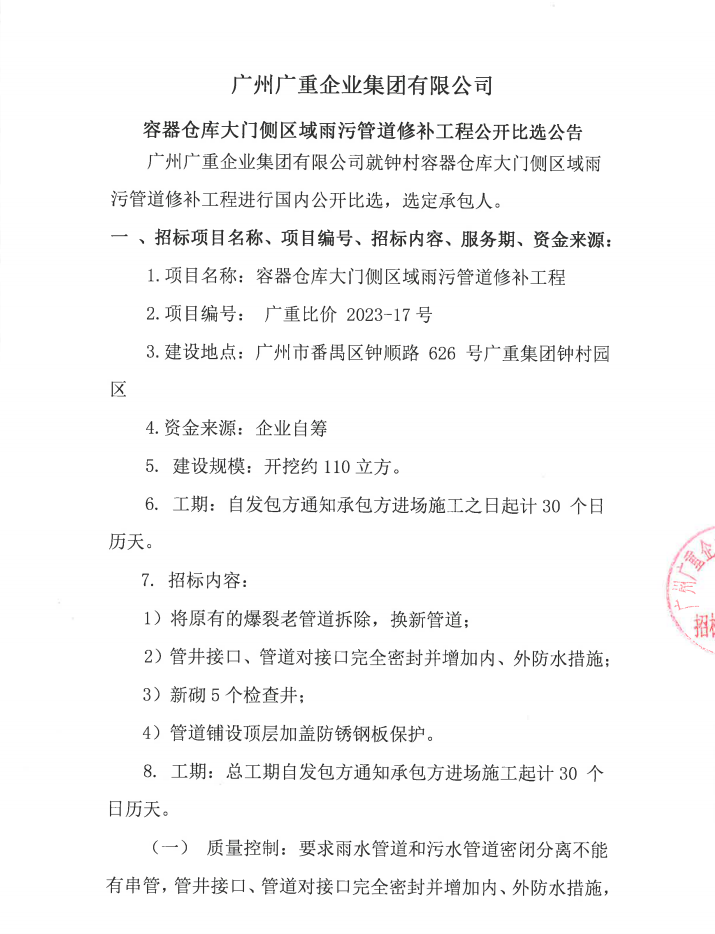 乐鱼网页版页面登录集团容器仓库大门侧区域雨污管道修补工程项目公开比选公告