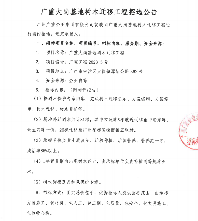 乐鱼网页版页面登录大岗基地树木迁移工程项目招选公告